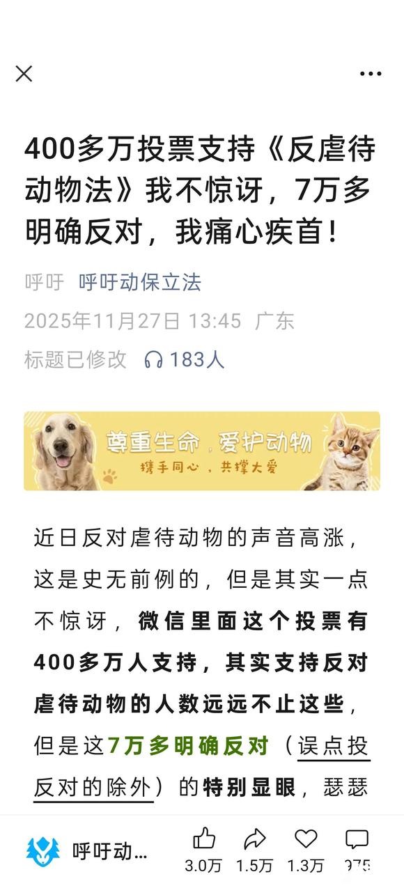 我投的是中立,你们怎么看,原因如下 1.投票本身不客观,这篇公众号文章认为博流量也好,或者为了保护动物也好,投票帖子都有明显引导性,并非中立的收集方式。 2.“虐待”界定太模糊,质疑不同动物(比如野猪、流浪...