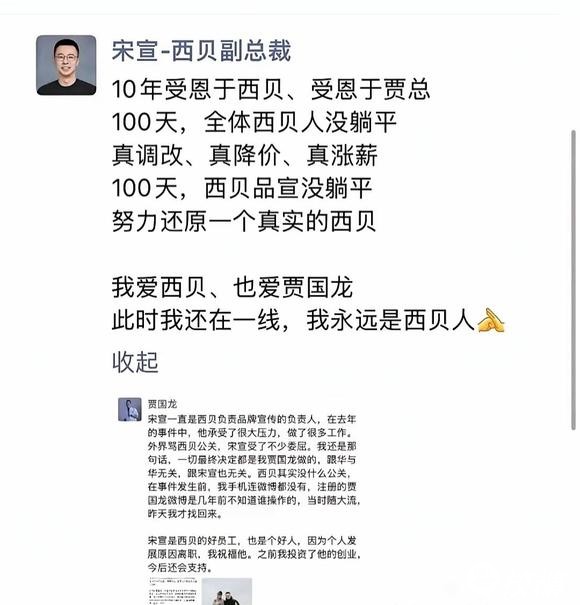 你可以努力工作,也可以给摸鱼,但你一定得要跟对人。 宋宣他说自己10年受恩于西贝和贾国龙,过去100天里西贝团队没躺平。 做了真调改、真降价、真涨薪的动作。品宣也在努力还原真实的西贝。 还直言“此时我还在一线...