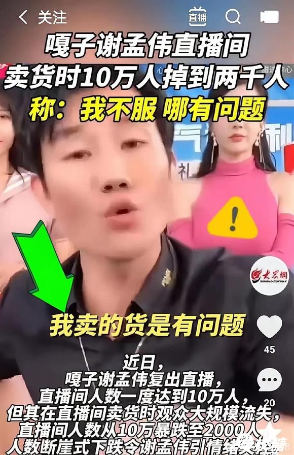 嘎子谢孟伟昨晚开直播卖货,十万人在线看他首秀,结果商品链接一挂,观众瞬间掉到两千。他当场愣住,拍着桌子喊平台搞鬼,说老艺人被限流。我看了全程,选品全是几十块的锅碗瓢盆,话术像背课文,价格也没优势,粉丝...